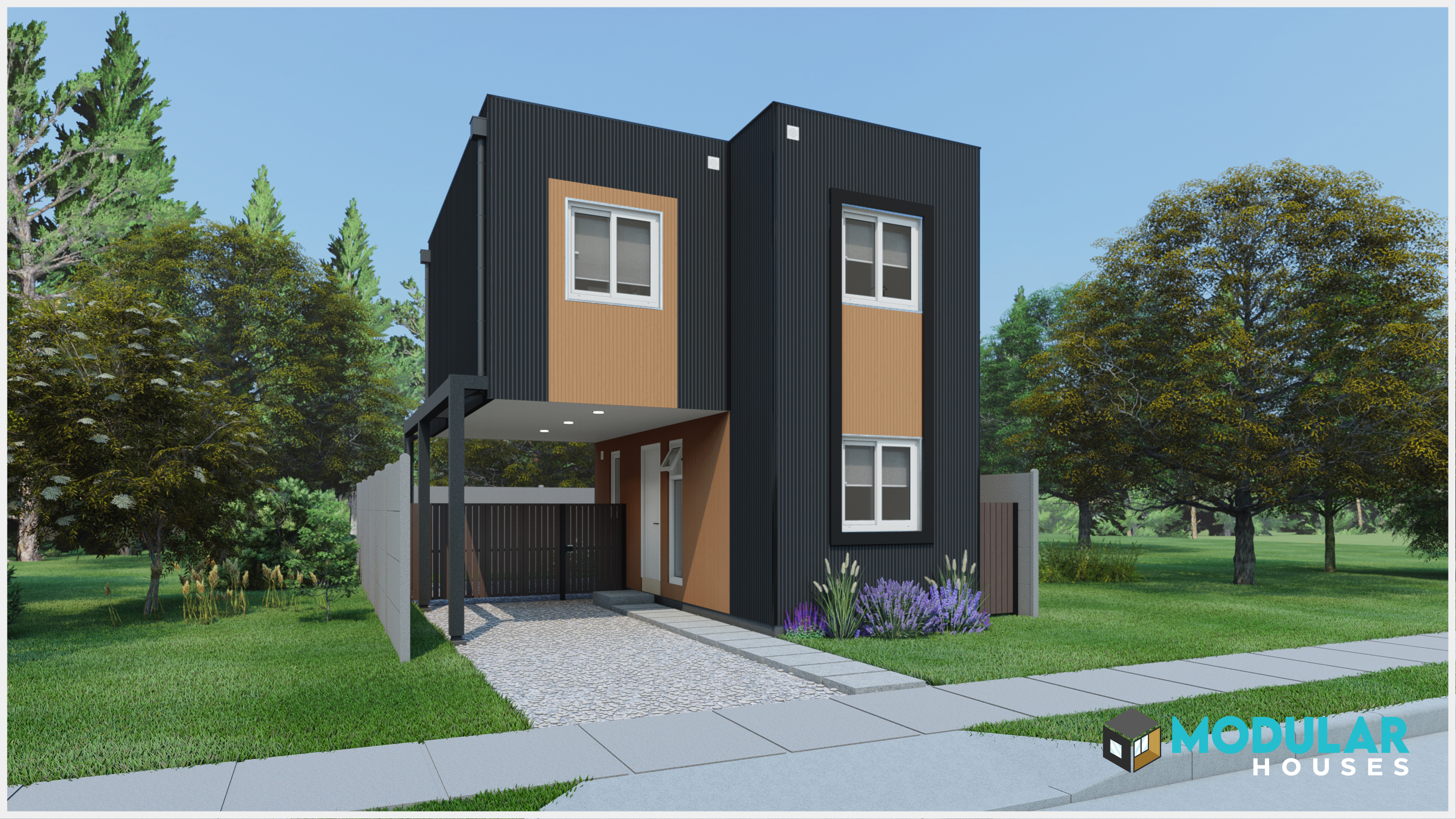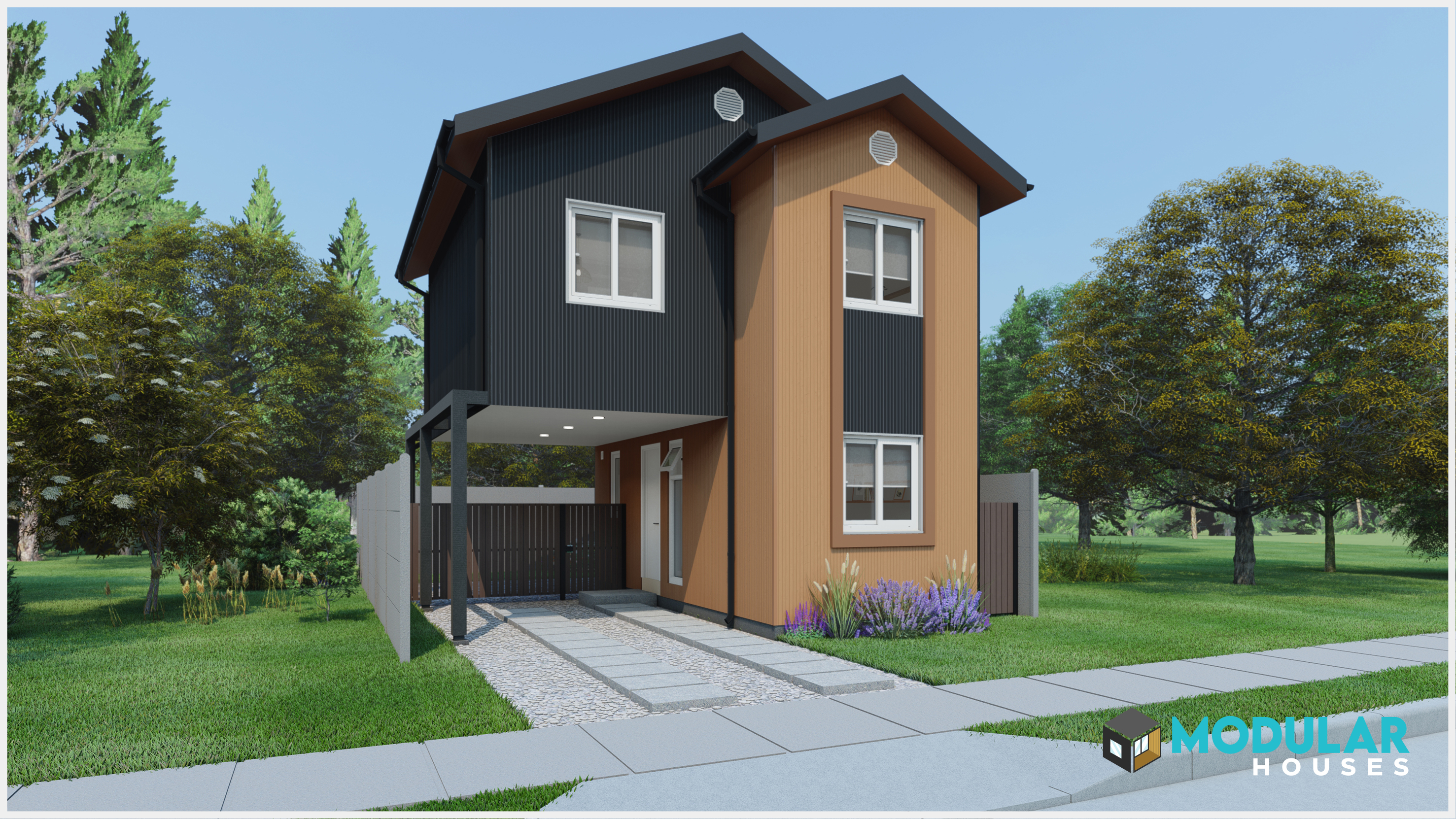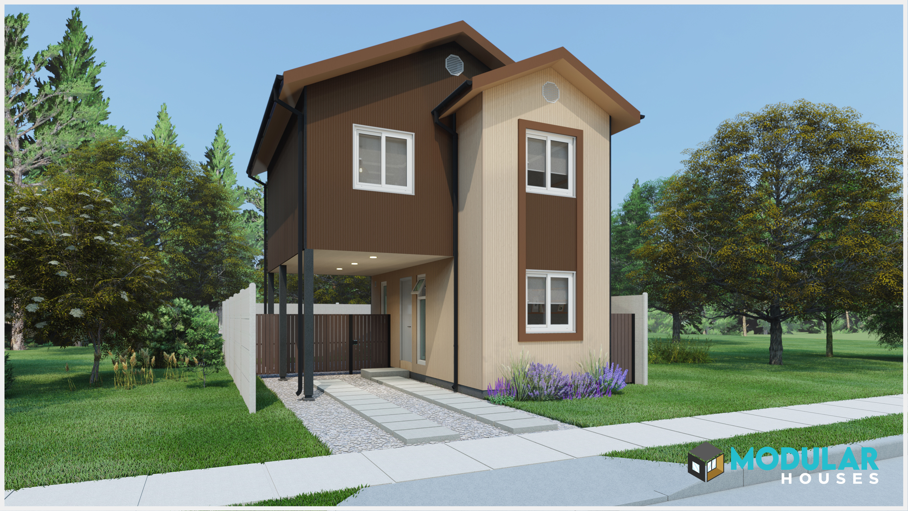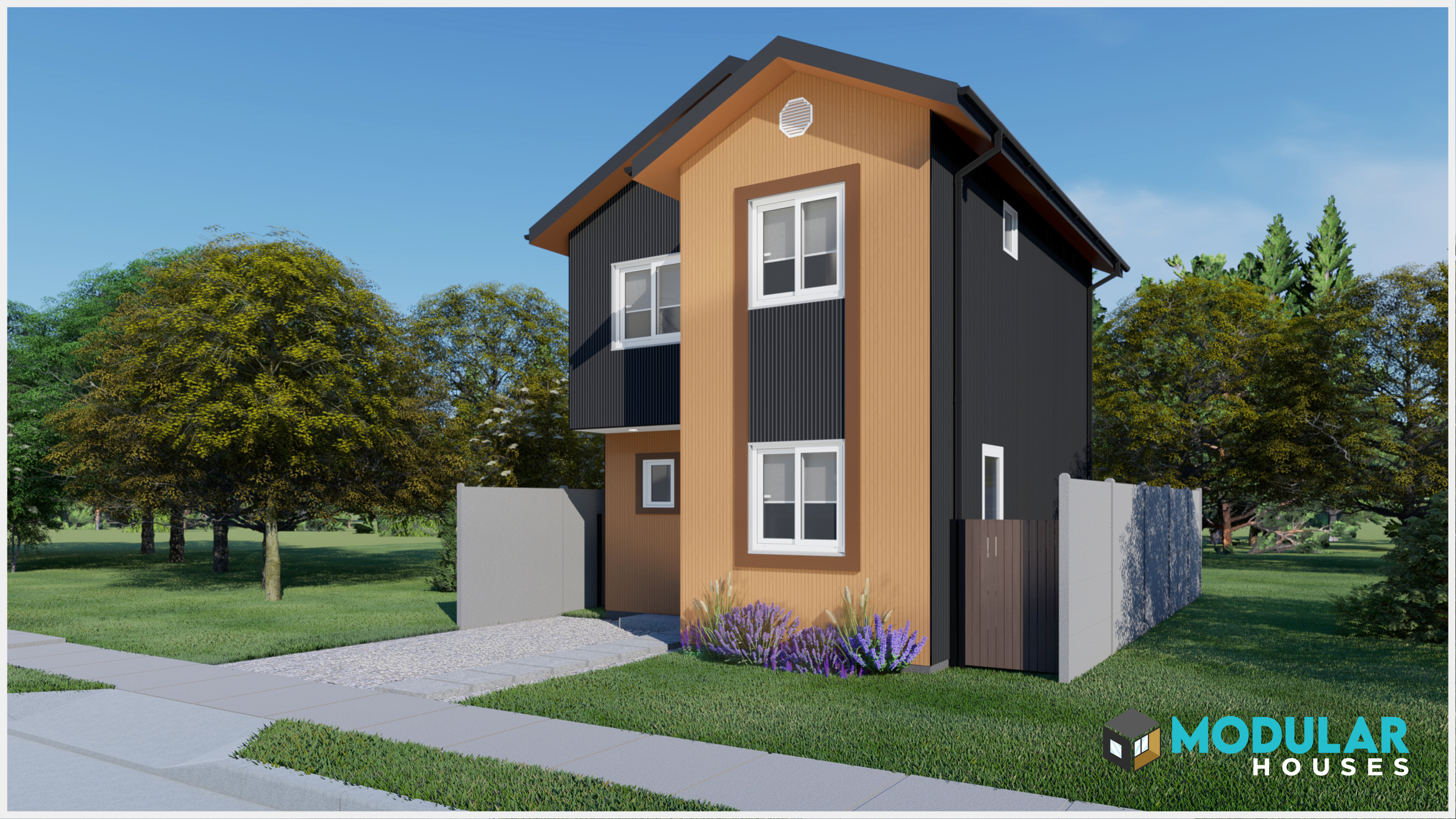 Su estructura de dos niveles modulares permite una distribución cómoda y funcional: zonas sociales en el primer piso y áreas privadas en el segundo.